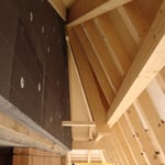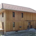 | Beschrieb | Fassadenverkleidung mit aufgedoppelter Lärchenschalung, mit horizontalen Brettern unterbrochen, Sparrenlage als Rohbauelemnte (Warmdach) |
