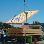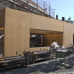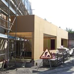 | Beschrieb | Satteldach mit schräg verlaufenden Giebelfassaden, vorfabrizierte Rohbauelemente, Fassaden mit Lärchenlamellen vertikal montiert |
