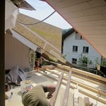 Beschrieb Teilabbruch und Erweiterung von Erd- und Obergeschoss. Ausführung der Konstruktion von Balken- und Sparrenlage, Montage von Lukarne mit Rohbauelementen.